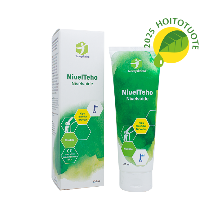 NivelTeho Ledkräm för besvärliga och smärtsamma leder som lindrar smärta, inflammation och svullnad. En inhemsk Avainlippu-produkt, tillverkad på ett finskt läkemedelsföretag i Tammerfors.